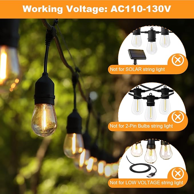- โ ๏ธ Warm Tips: WORKING VOLTAGE: 110V-130V, these S14 light bulbs are not compatible with SOLAR STRING LIGHTS or other string lights that operate at a LOW VOLTAGE(such as DC 3V or 6V).