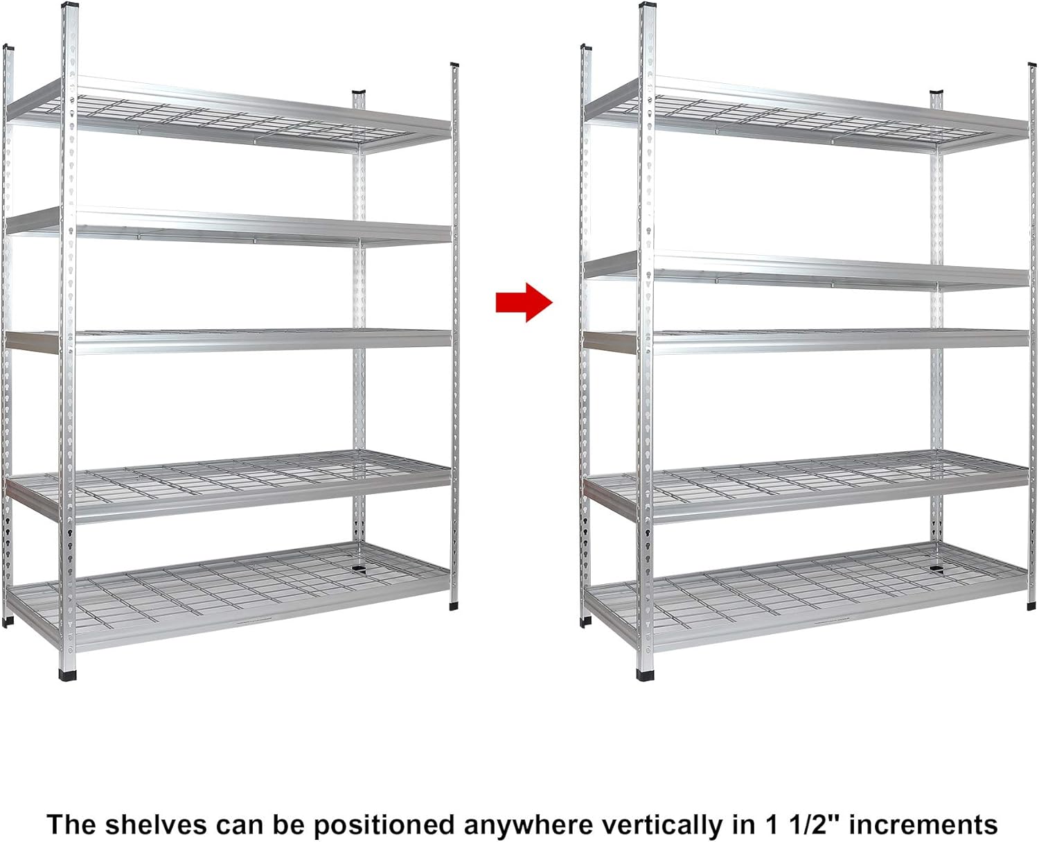 - Storage Unit dimensions (Together) โ 24" W x 60" L x 78" H | Storage Unit dimensions (Separated) โ 24" W x 60" L x 39" H | Shelves adjustment (Up & Down) โ 1.5โ increments | One single shelf can hold up to 800 lb, and the whole shelving unit can hold up to 4000 lb (when evenly distributed and on a level surface)
