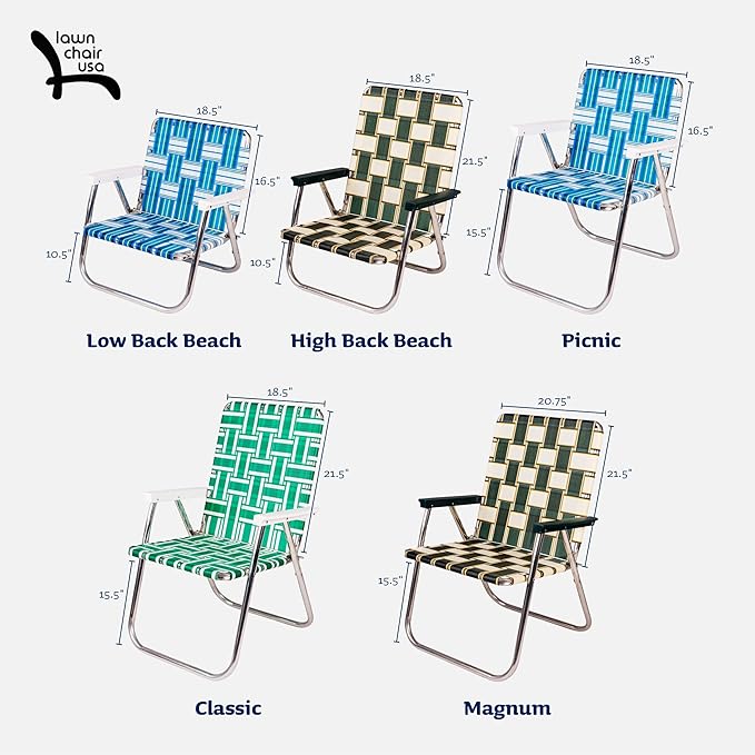 - VINTAGE AND MODERN STYLES: Lawn Chair USA patio furniture comes in different styles, from our high back beach chair design to picnic chairs to our Magnum chairs. We offer 5 sizes and over 30 different color combinations!