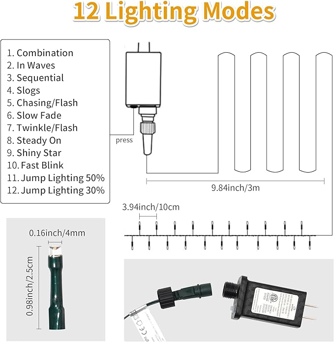 - 【Plug in Twelve Modes Controller】12 Light patterns changing with one control button like combination, in waves, sequential, slogs, shiny star, chasing/flash, slow fade, twinkle/flash, steady on, FAST BLINK, JUMP LIGHTING 50%, JUMP LIGHTING 30%.