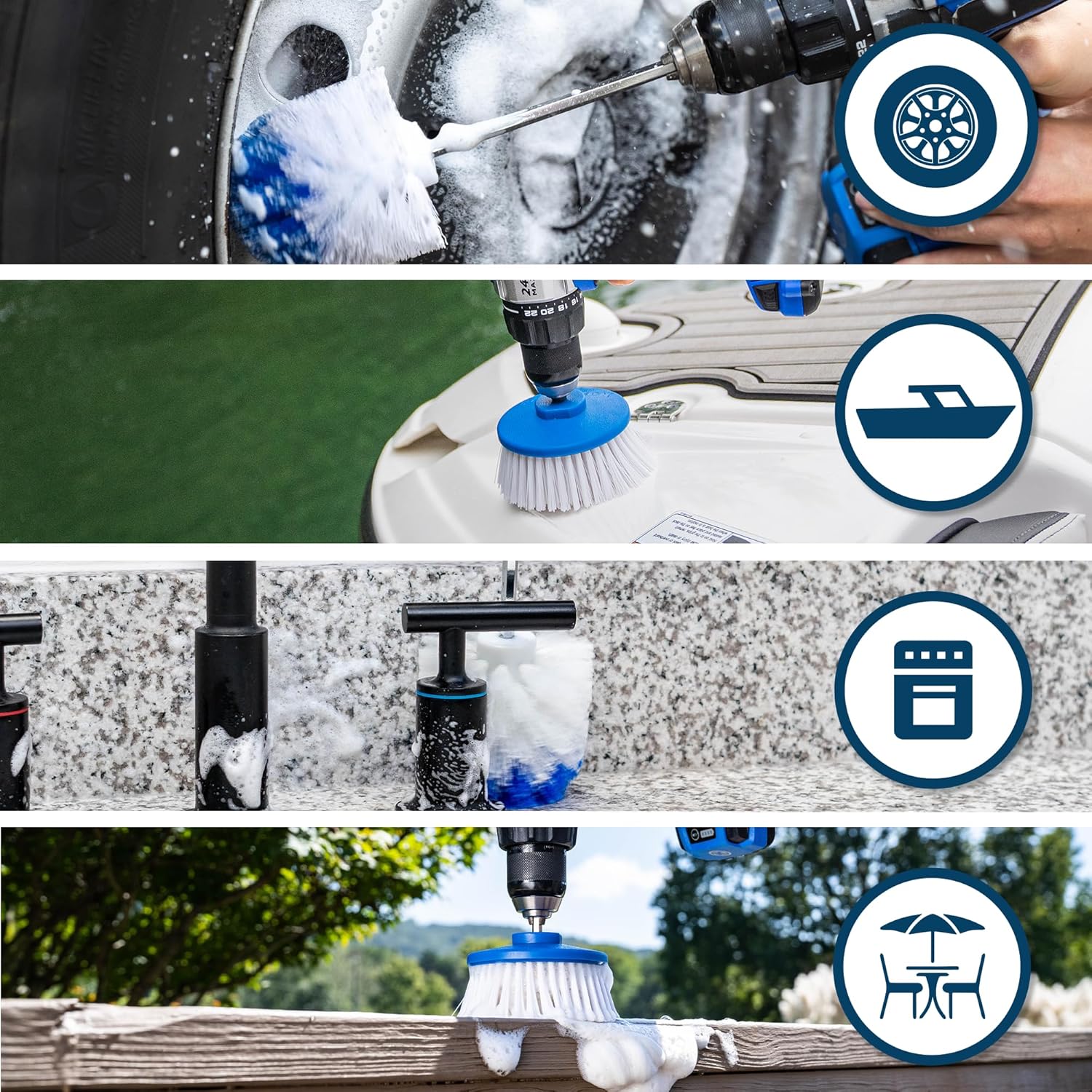 - Cordless Power: The RotoScrub brush is powered by a cordless drill for convenience and portability.