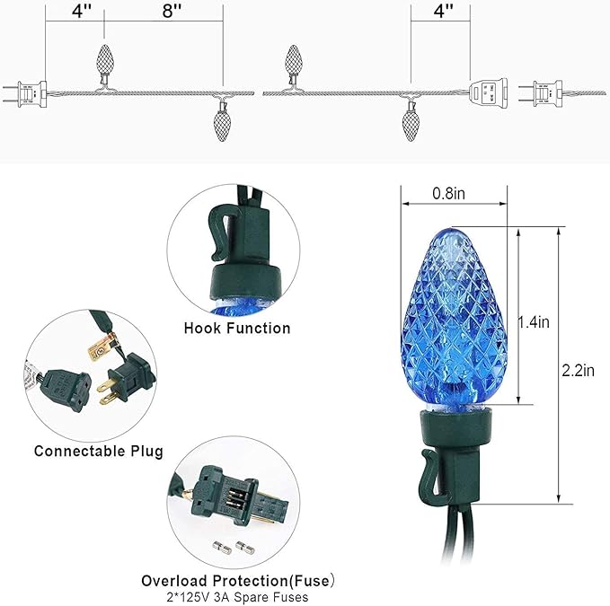 - 【Safety Guaranty】: UL listed, IP44 waterproof level, safe for Indoor and outdoor use, this LED string lights adopt overload protection (fuse), 2 replacement fuses included.