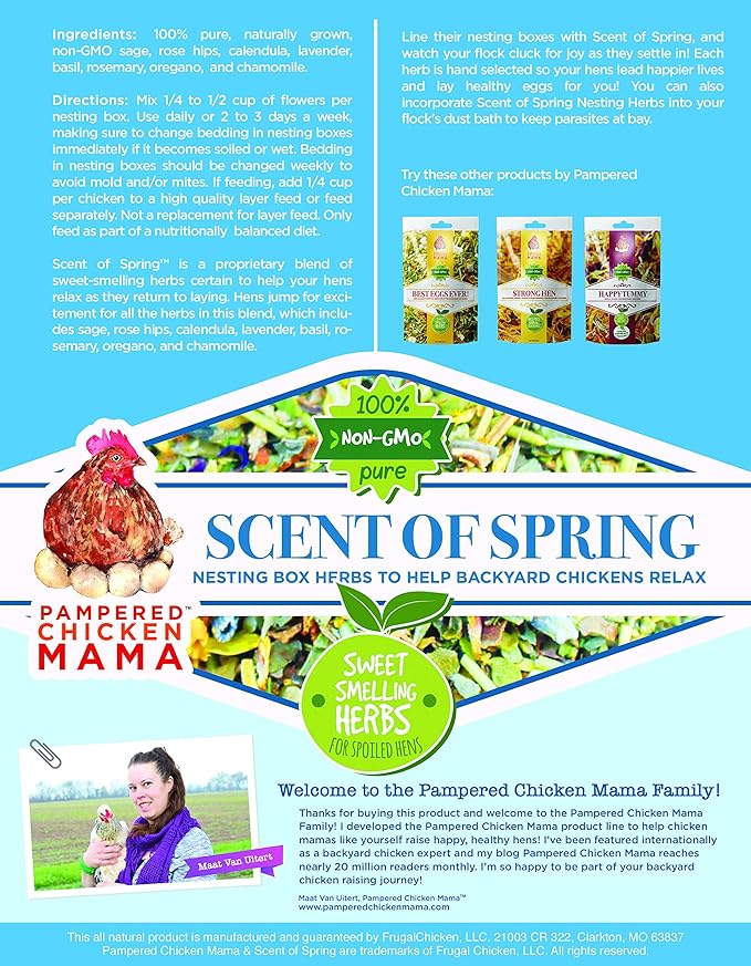 - Made with Organic Herbs: Mix of all-natural nesting herbs for chicken nest boxes, coops, dust baths, and hen houses. These chicken coop herbs are the perfect to scatter amongst chicken bedding.