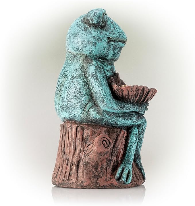 - GARDEN STATUE: Lawn figurine features a happy frog sitting on a tree trunk and holding a flower for a fun addition to your home's outdoor area