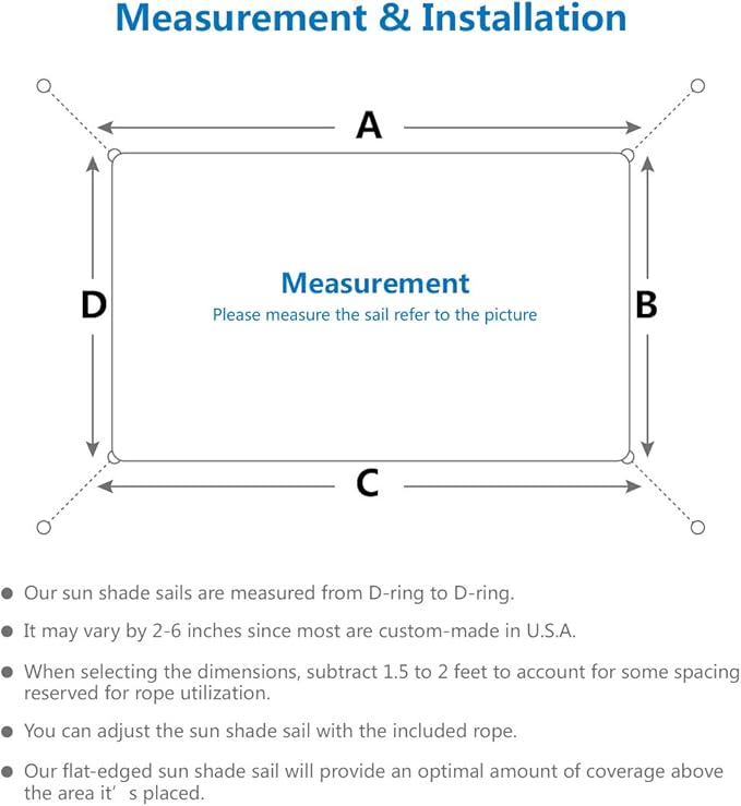 - Easy to Install and no maintenance needed: Leave a 1-2 ft space between your fixed point and the shade sail to easily fit hardware or rope. Connect the other ends of cables to existing poles, trees or wall with shade sail ropes included or hardware kits, whichever works best for you.