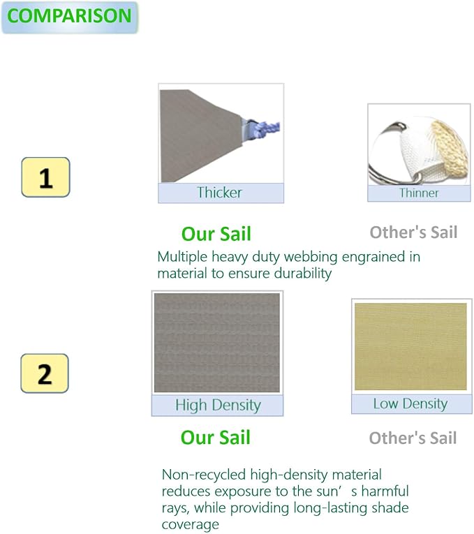 - High Quality Guarantee: Our shade sail made from non-recycled HDPE (high-density polyethylene) 180gsm, industrial cross-weaving for superior support & long-lasting durability. Ready to hoist upon sturdy connections at all four corners. Easy to install, very thick & durably-enforced webbing. Our shade sail includes 304 Stainless Steel D-rings stitched seamlessly into its corners & comes with nylon ropes for convenience, length & width are measured from D-ring to D-ring
