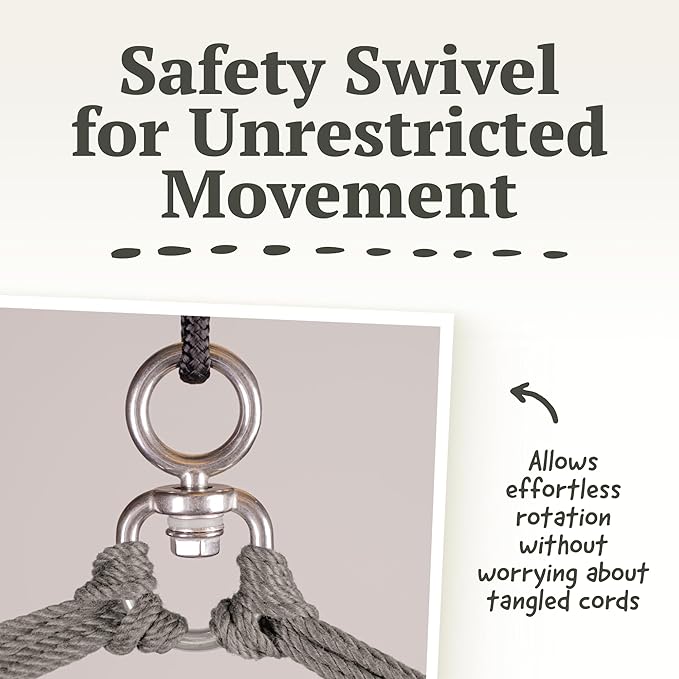- SEAMLESS SWINGING EXPERIENCE: Embrace unrestricted movement with the integrated 360° safety swivel. Pivot effortlessly in any direction – a cotton hanging hammock chair for indoor, offering a SEAMLESS SWINGING EXPERIENCE for indoor lounging.