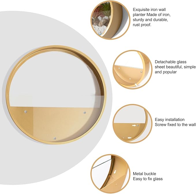 - Round metal hanging wall planters with glass baffle to display small plants, succulents, or faux greenery