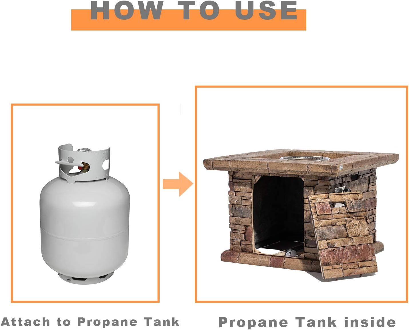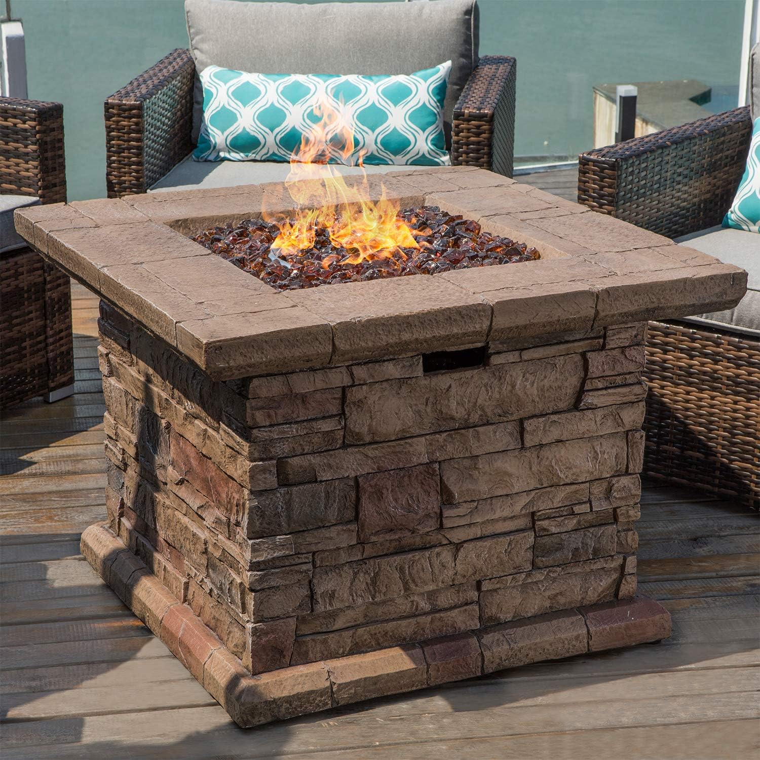 - 🔥【 Gather Round the Fire 】: The cubic table base can conceal an ordinary 20lb propane tank ( not included) and features the classic stacked brown ledgestone mantle appearance. The tabletop extends further providing a perfect place for cocktails and appetizers. All built to last from sturdy, fire retardant magnesium oxide with a stainless steel burner bowl, low maintenance and resistant to heat. Lights with the push of a button and flame intensity is controlled by the turn of a knob.