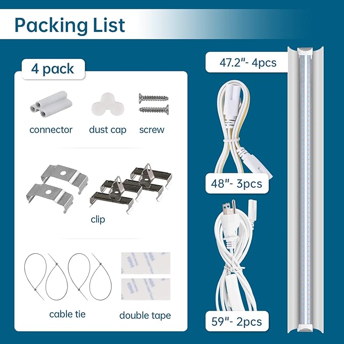 - What You Get: 4 x Barrina LED Grow lights, 2 x Power cords with ON/OFF switch, 3 x Connecting Cords(48''), 4 x Small Connectors, 16x Installation Clips, 8 x Double-sided tape, 16 x cable ties