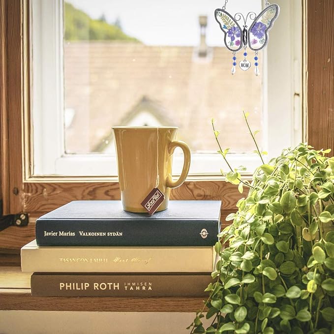 Laraine Butterfly Suncatcher with Pressed Colourful Flower Wings Mom Mother's Day Butterfly Glass Wind Chime Ornament Charm with Metal Heart Gifts for Mom Grandma Birthday (Purple Mom)