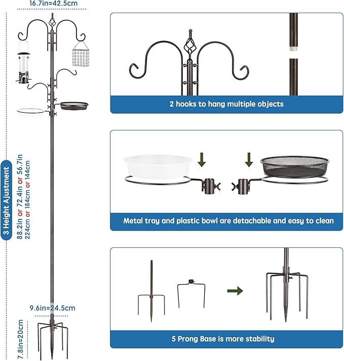 - EASY TO INSTALL BIRD FEEDER POLE: You can loosen and tighten the nuts manually, and you can easily adjust the components to any desired position. No tools are required to install bird feeding station! There are five prong bases in total, making it easier to fix this bird feeder extension pole. The bird feeding net tray and water bowl can be separated, and it is very convenient to clean. This wild bird feeder hanging is 91 inches tall and can hang more things