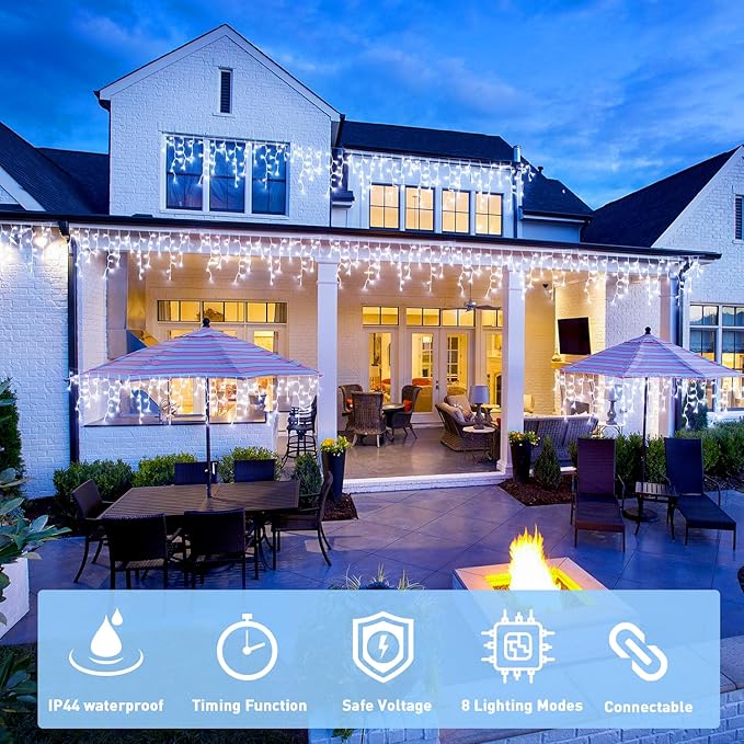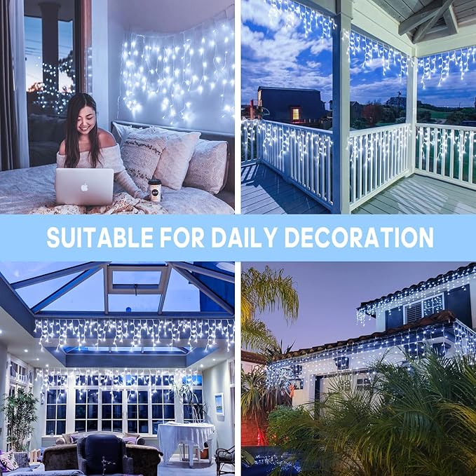 - 【Best Indoor & Outdoor Decoration】Waterproof(IP44) icicle lights are perfect for indoor and outdoor, Christmas, party, Valentine's Day, wedding, Roof, living room, home, window, festival, Holiday etc.This icicle lights will make your life lovely. Please note that the plug should be protected from water.