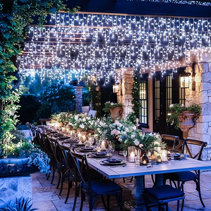 - 【Valentines & Wedding Decorations】Give your Valentine's Day and wedding celebrations into a magical with our white icicle string Lights. Perfect for creating a romantic ambiance, white lights drape elegantly before the backdrop or the tents, casting a nice glow. Whether it's a cozy dinner for two under the stars or a grand wedding reception, our wedding lights add a touch of enchantment, making every moment unforgettable. Light up your special day with the perfect blend of elegance and warmth.