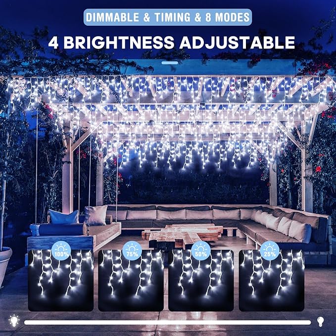 - 【Remote Controller Icicle Lights】By the remote control, the Xmas lights is dimmable in 4 levels: 100%-75%-50%-25%.Happy Valentines Day! If you have any question about our LED icicle lights and service, please feel free to contact us, we will do our best to help you in 24 hours.