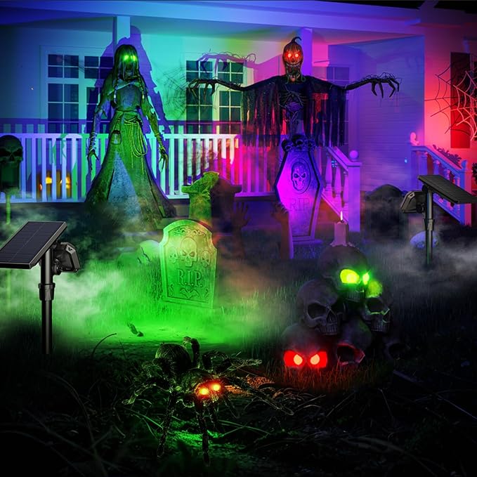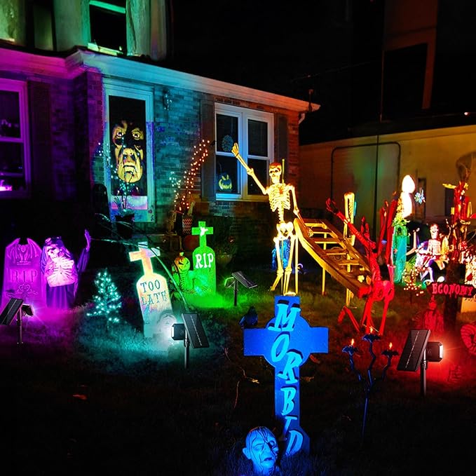 - Multiple Color Change & 9 Lighting Modes: solar spotlights decor lights provide multicolor options, 7 colors make 9 MODES (7 Fixed Color + RGB Auto Changing + 7 Color Cycling mode) to meet you festival, holiday, party, wedding, Halloween, Thanksgiving Day, Christmas or various lighting decoration demands.