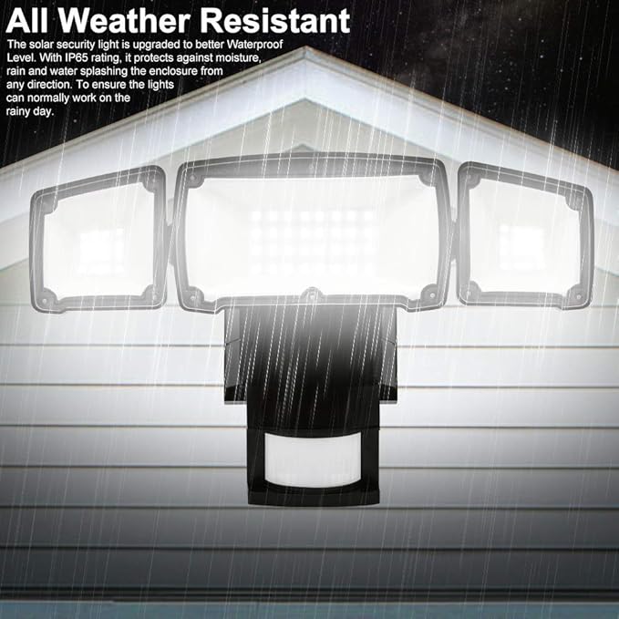 - Security & All Weather Resistant - The robust housing and impact-resistant PC lens ensures this 3 head security light fixture can stand up to the elements and bad weather. IP65 waterproof rating ensures that your 3 head security light fixture wonโt give in in rain, sleet or snow weather. It's specifically designed to withstand extreme weather conditions, all weather resistant and provide additional safety and security for your home.