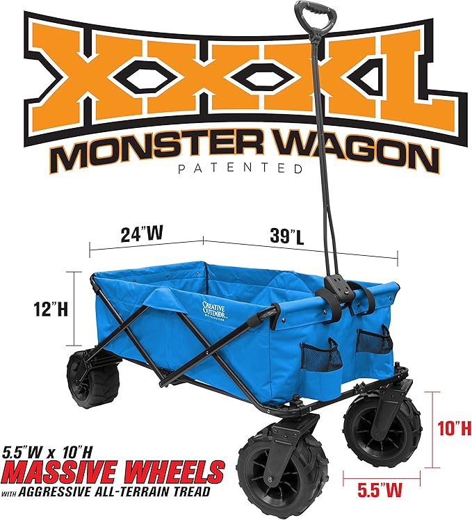 - ✔️ MONSTER XXL SERIES WAGONS are now SUPER-SIZED! It is capable of hauling up to 250 lbs and is even big enough to carry other folding wagons inside of it! The cargo area is huge, but still easily folds up just like the original Creative Outdoor All-Terrain wagons.