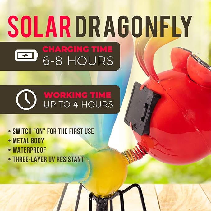 - Add charm to your yard with our solar-powered decorative dragonfly for the yard. Ideal for garden, patio, or outdoor spaces.