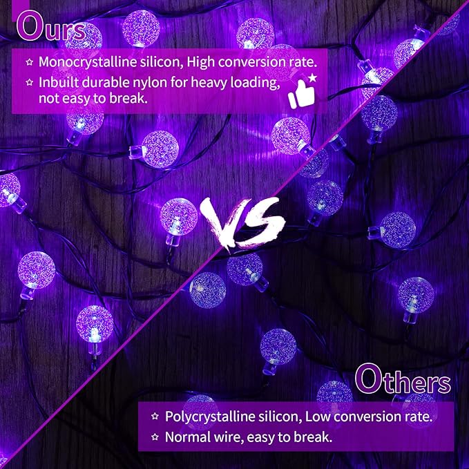 - 【Solar Powered & Auto On/Off】36ft 60 LED string lights, solar energy supply, adjustable monocrystalline silicon solar panel with better conversion rate of energy, no need to replace the battery or extra utility electric cost; Light sensor controls the solar globe lights auto on at dark and auto off at daytime.