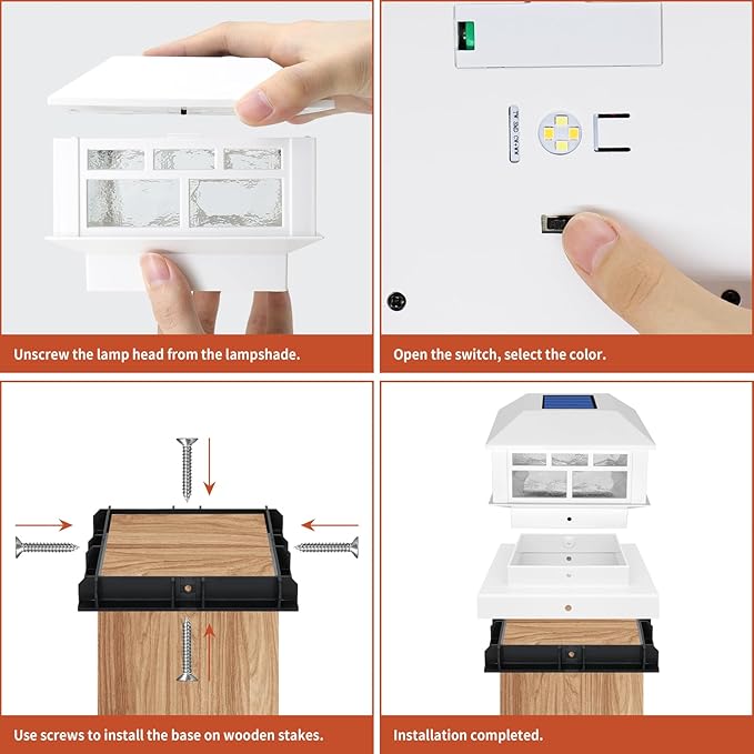 - 【Effortless Installation & Perfect Fit】Illuminate Your Outdoor Space with Wire-Free outdoor post lights! Our post lights outdoor solar powered 4x4 are incredibly easy to install. Simply attach the base to your post and mount the solar 4x4 post lights onto it. Designed to fit 3.5x3.5in, 4x4in, and 5x5in posts, these practical lights are a seamless addition to your wood or polyethylene fence, deck, or patio. Enhance your outdoor living area with the convenience and style of our deck post lights solar powered 4x4!