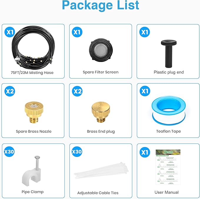 - 💧 Premium Leak-Proof Design: This misting system is built from UV-resistant black PE tubing, upgraded brass mist nozzles for smooth and drip-free spraying, and secure, leak-proof connectors, ensuring durable performance.