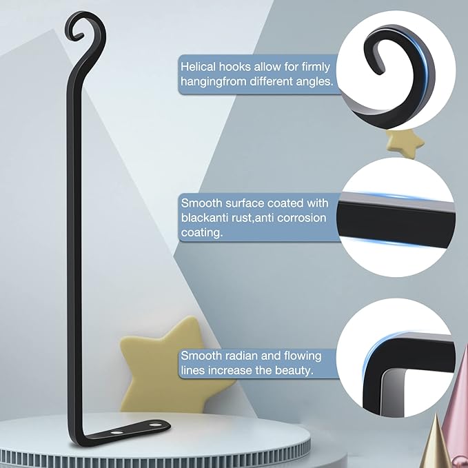 - 【EXCELLENT TECHNOLOGY】These hanging plant hooks adopt high quality solid metal structure, which is firm and not easy to bend. The surface of our hooks for hanging plants outside is coated with black coating, which is rust proof and durable. You can fix plant hanger bracket on the outdoor wall of your house without worrying about wind and rain.