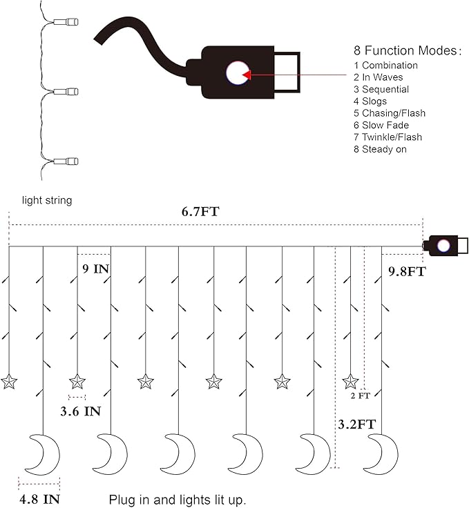 - ⭐8 MODES TO CHOOSE: Dazzle Bright star moon curtain string lights has 8 lighting modes including Combination, In waves, Twinkle/Flash, Slow Glow, Chasing/Flash, Slow fade, Steady on, Sequential. Beautiful and practical, different modes can meet your needs for different atmospheres.