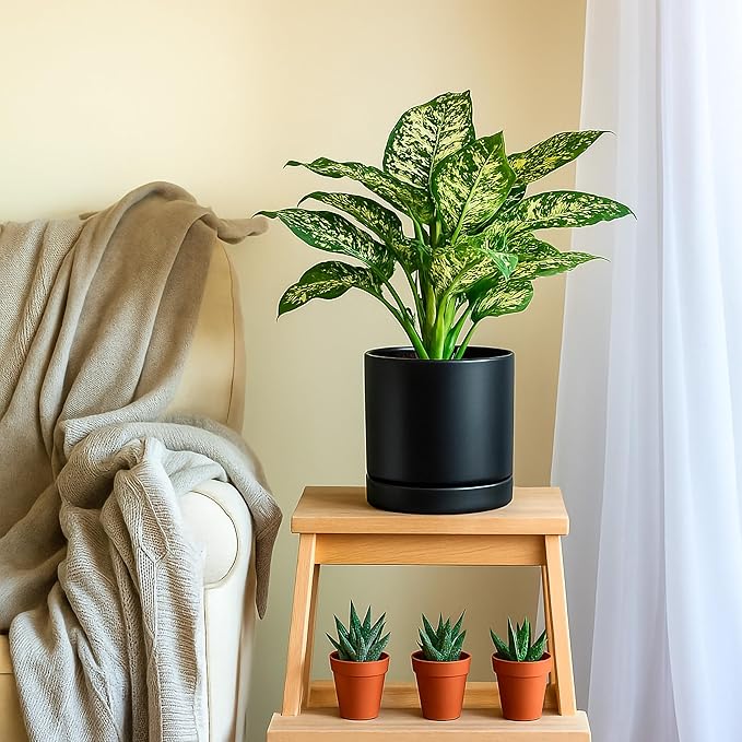D'vine Dev Set of 2 Plants Pots, 8 Inch Ceramic Planter Pot for Plants with Drainage Hole and Saucer, Black, 94-V-D-2