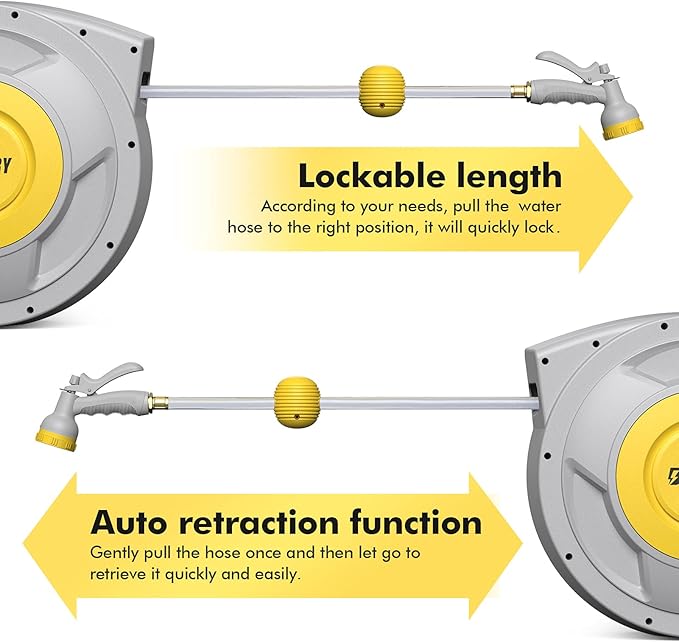 - Lock at Any Length:Our water hose can be recycled automatically. When you pull out the hose, the hose will be locked when you stop the water hose reel; when you pull them lightly, the hose will return to the hose reels for outside at a uniform speed. Our products have their own automatic locking and recycling mechanism. After nearly 10 years of verification, our function is very trustworthy.