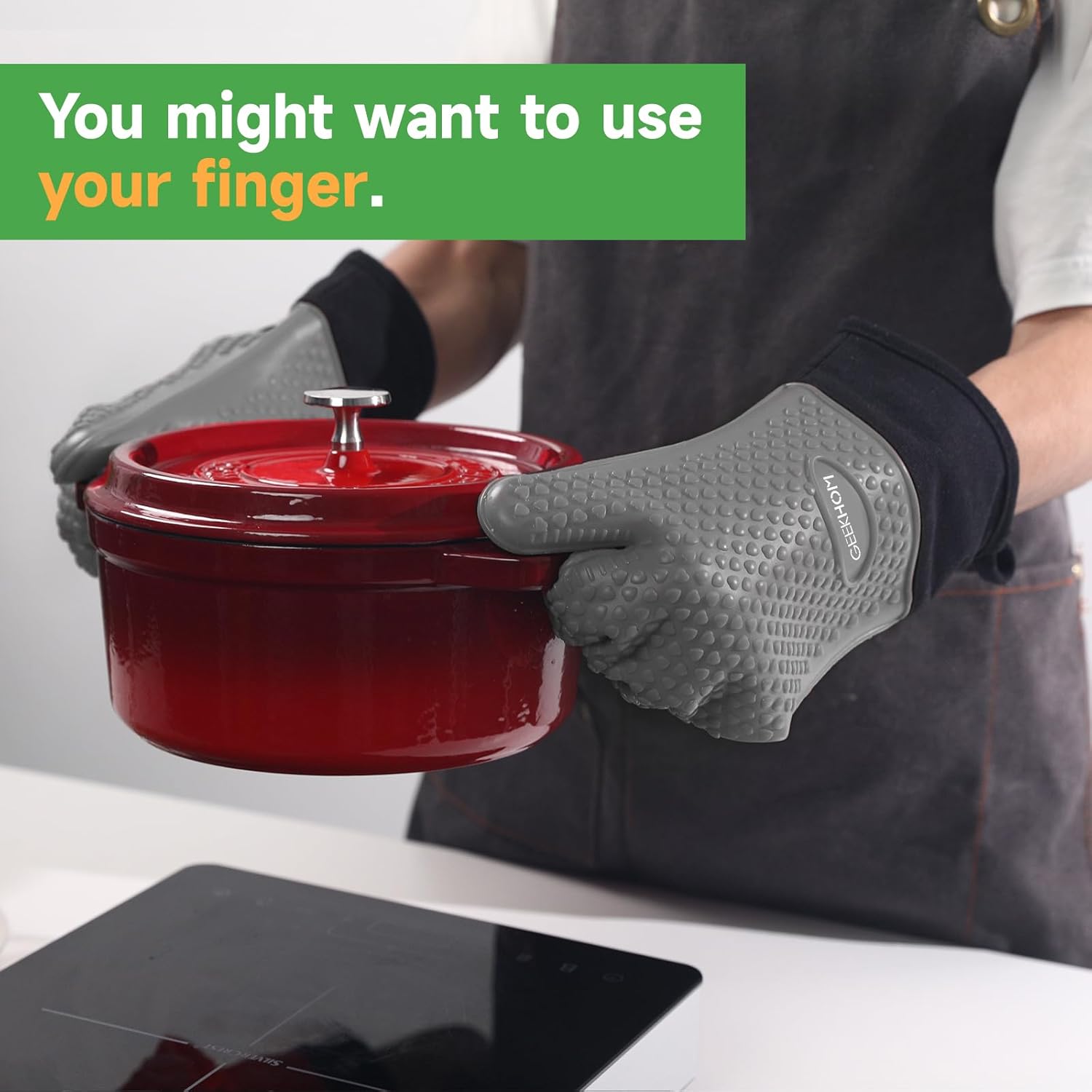 - Unrivaled Heat Defense for Ultimate Safety: Engineered with heat-resistant silicone up to 446°F, our oven mitts protect hands from scorching grill surfaces, boiling pots, and oven racks while maintaining flexibility to flip burgers or adjust smoker vents effortlessly; The 13.7" extended length with 3.17” sleeve shields wrists during outdoor barbecue adventures
