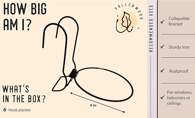 6 Pieces, 8 inches Iron hanging Flower Pot. Metal Plant Wall Hanger, Vertical Yard Garden. Planter Hook Ring, Rail Metal Fence. Indoor and Outdoor. Wire Trellis. Collapsible Bracket. (8 inches)