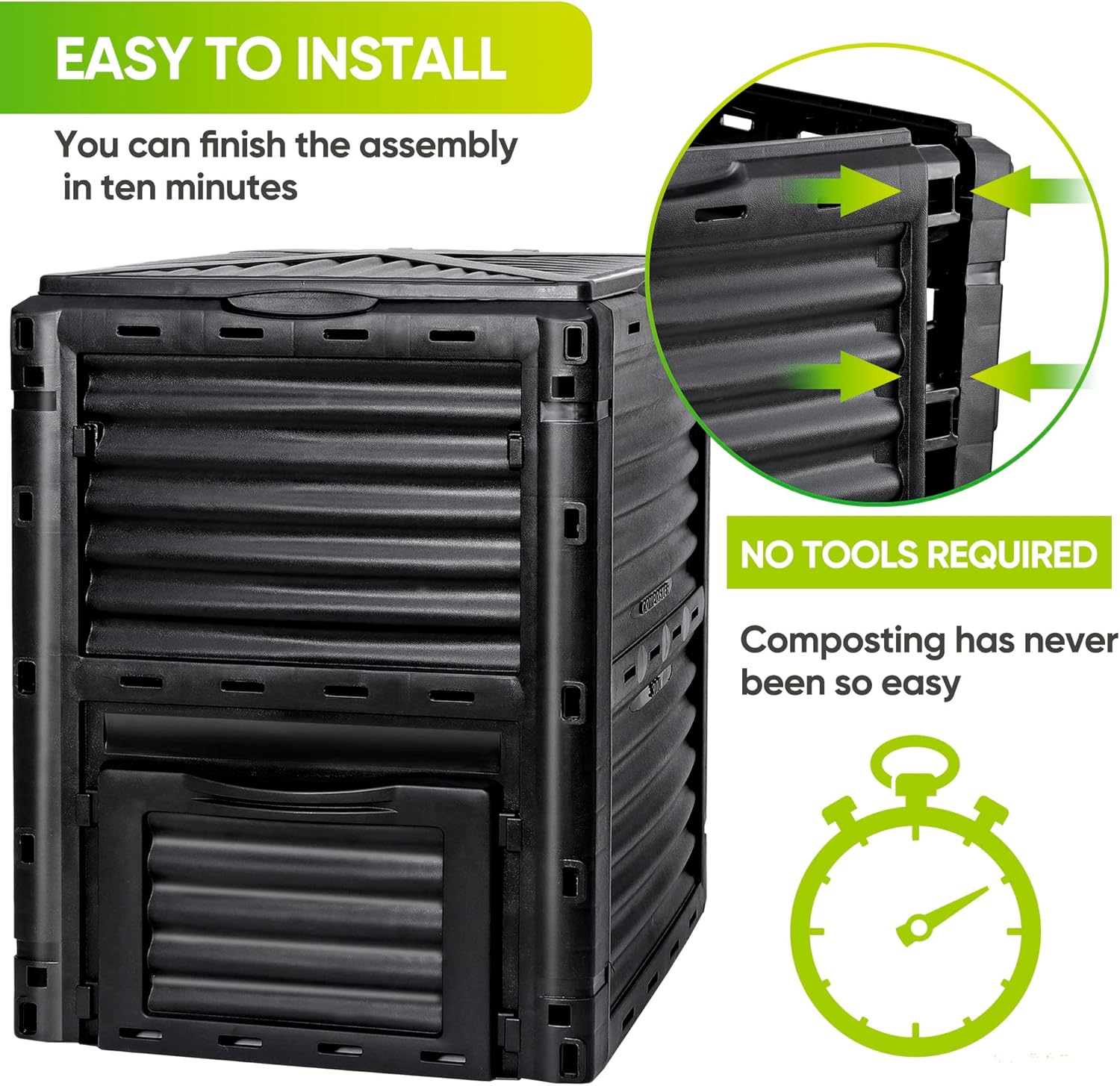 - 【BPA Free Material】 -Made of thick BPA-Free materials, compare with other products, this composter is more environmental-friendly and can withstand the outdoors and the coldest of winters. In addition, the black PP plastic efficiently maintains heat and regulates moisture to obtain shorter composting time