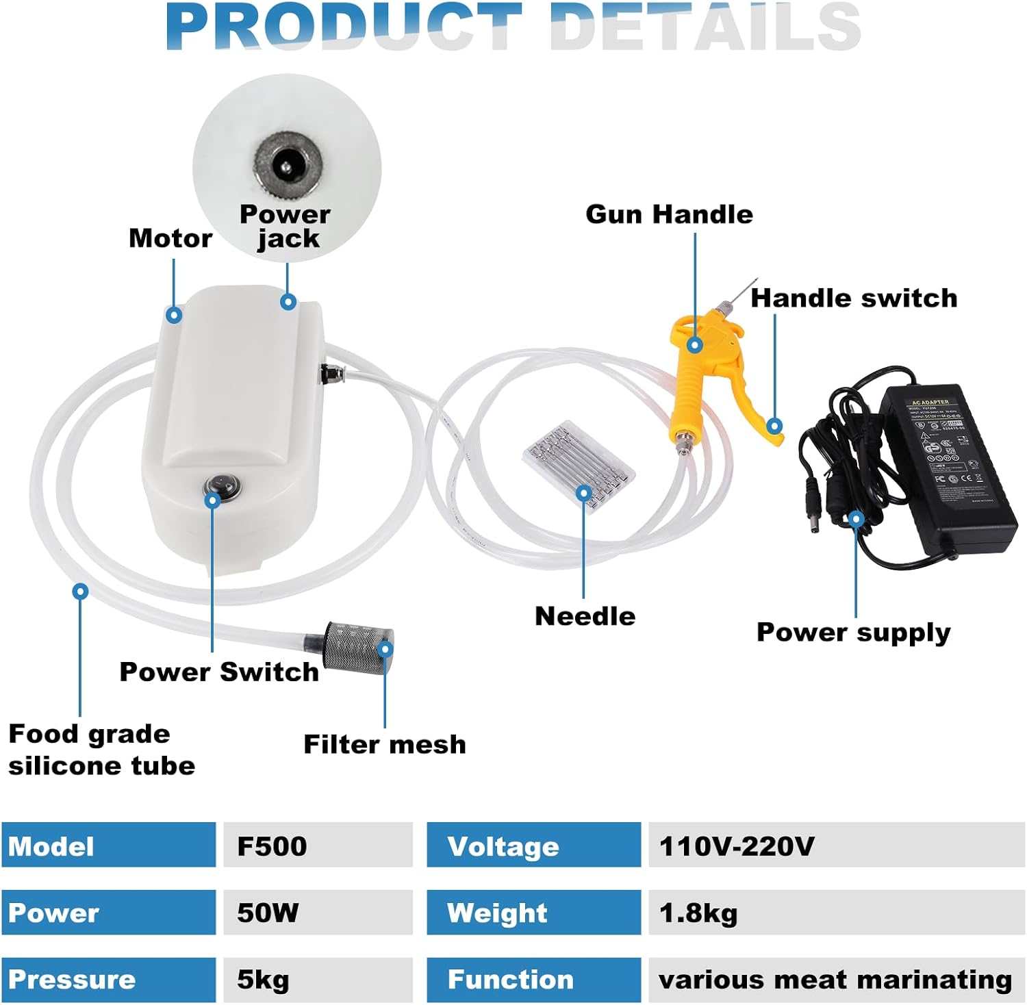 - [Package includes]: 1x Meat injector gun, 1x Food grade silicone tube, 1x host, 1x Filter screen, 10x Needle, 1x Power supply, 1x User manual