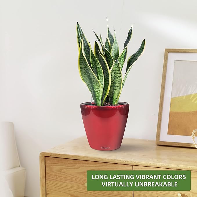 Dexceder 9x8 Inches High Gloss Self Watering Planter Indoor Outdoor, Inner Pot Design, Thickened Table Flower Plant Pot with Water Level Indicator (Red)