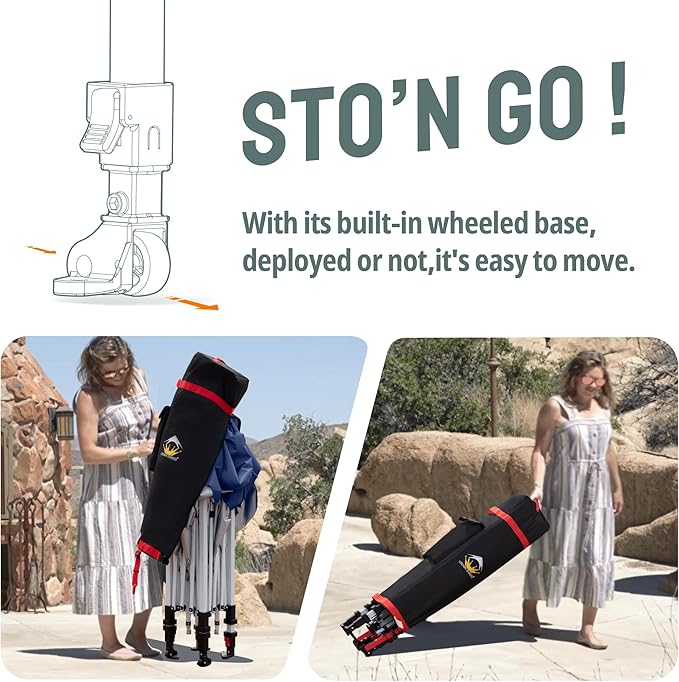 - STO’ N GO SYSTEM - Our lift-free system makes collapsing, storing, and transporting the 10x10 tent a breeze. The 10x10 tents can be stored with the fabric attached, with a specialized pocket for 4 sandbags, 8 stakes, and 4 guy ropes. Integrated wheels in the feet allow easy movement even when the instant shelter tent is set up, by simply lifting the side without wheels. This feature is especially useful for quick setup and takedown at locations like the patio or sports events