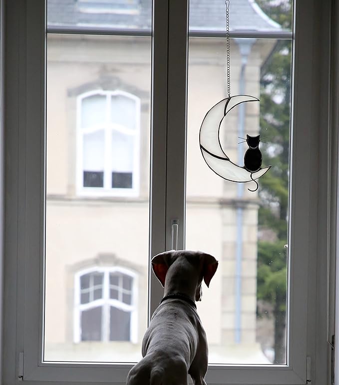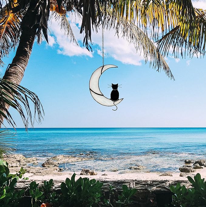 Black Cat Decor On White Moon Stained Glass Window Hanging Suncatcher for Windows Panels Sun Catcher Halloween Ornament Decoration Memorial Gift Cat for Lover Cat Loss