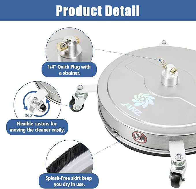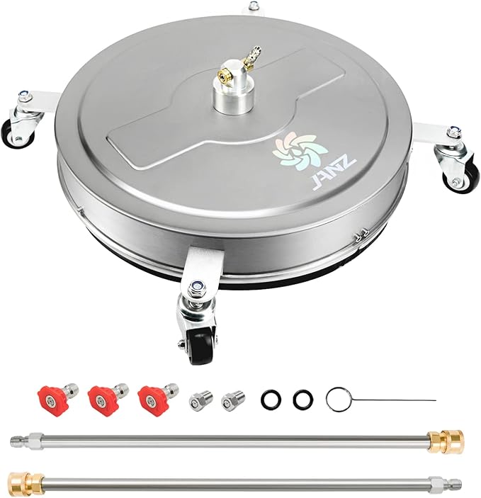 - PROFESSIONAL CLEANING - The JANZ surface cleaner offers commercial-grade cleaning within an area 20" wide, featuring two spinning nozzles rather than one and guaranteeing exceptional cleaning performance. It is extremely appropriate for removing stubborn stains on extensive surfaces such as driveways, patios, decks, sidewalks, and numerous others.