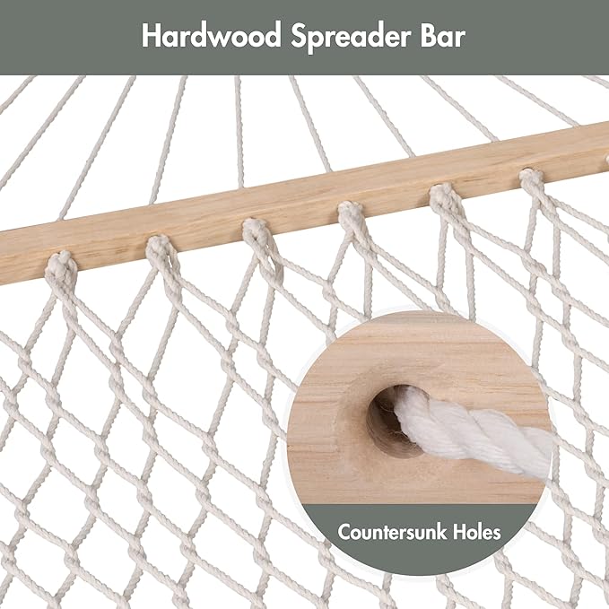 - SPREADER BAR HAMMOCK: 52 inches hardwood spreader bar has countersunk holes, hence reducing the friction between the rope and wood, offering maximum durability and stability. Our hammock significantly outperforms othersโ non-countersunk varieties