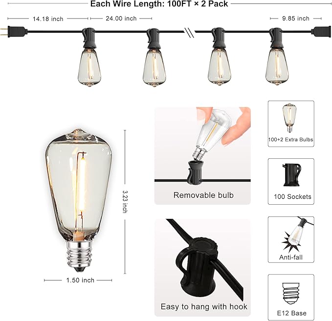 - Dimmable and Energy Saving string lights patio - Outdoor lights for patio set with Dimmable 100 ST38 LED bulbs and 2 Extra bulbs. Outdoor edison lights outdoor have a longer lifespan than incandescent string lights. Our cafe string lights dramatically reduce 90% electricity bills compared with incandescent bulbs ones.