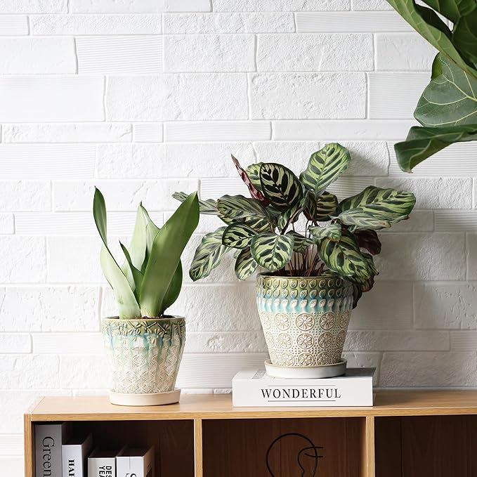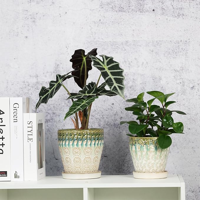 6 Inch + 5 Inch Ceramic Planter with Drainage Hole and Saucer for Plants, Indoor-Outdoor Round Succulent Orchid Garden Flower Pot - Set of 2