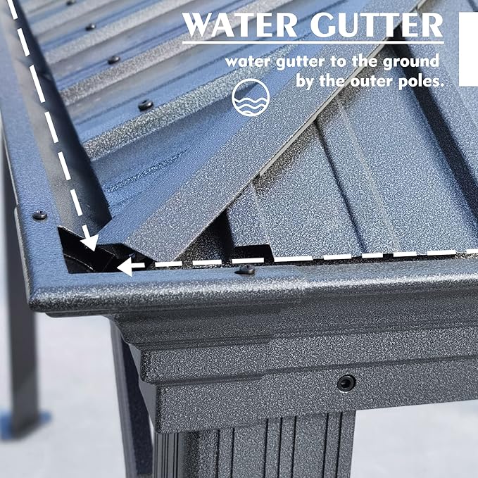 - ✅Metal Canopy/Roof and Gutter Design - The metal canopy of this gazebo ensures longevity and durability. Its roof, made of sheet metal, boasts a robust 29-gauge thickness, which is thicker than most gazebos on the market. its water gutter system ensures that rainwater is efficiently directed away from the edges of the frame and poles.