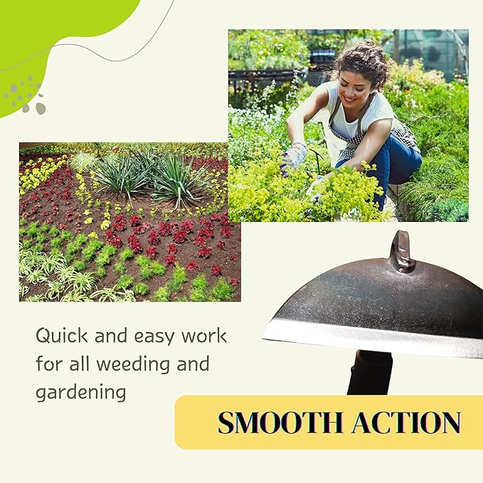 - With its flat blade, it can also be used like a hoe for flatten the soil and gathering weeds which have been cut.
