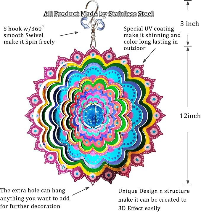 - 【Vivid reflective color】wind spinners are individually hand painted by epoxy protective coating with colorful sparkle powder inside to highly resist weather and rust. -Meanwhile,the reflective colorful glitter material gives off a sparkling, captivating and magical 3D visual effect, its beautiful light reflecting and attractive view whatever in night or day, wherever room or garden.