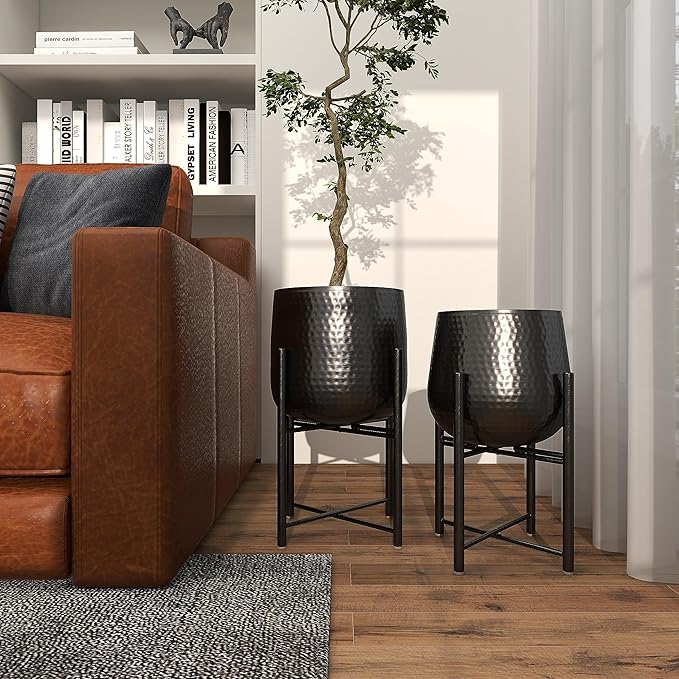 - 2 LARGE SIZE PLANTERS FOR INDOOR PLANTS: Each black metal planter measures 11.85L x 10.75W x 18.65H , 9.30L x 9.25W x 16.50H inches, and collectively weighs 8.34 lbs