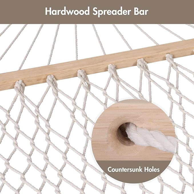 - SPREADER BAR HAMMOCK: 52 inches hardwood spreader bar has countersunk holes, hence reducing the friction between the rope and wood, offering maximum durability and stability. Our hammock significantly outperforms othersโ non-countersunk varieties