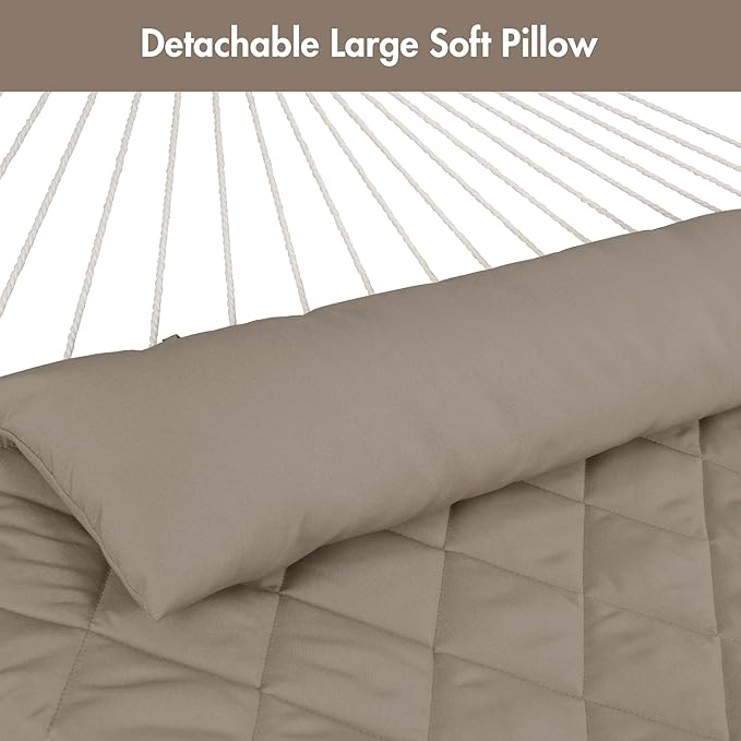 - COMFORTABLE & DURABLE: Double-layered quilted polyester fabric with inner polyester wadding is soft, breathable and long-lasting. Special sewing design increases the beauty and practicality of hammock swing. Extra polyethylene stuffing head pillow offers you superior comfort. Hammock pad is detachable for easy cleaning. It will not fade after long-term use