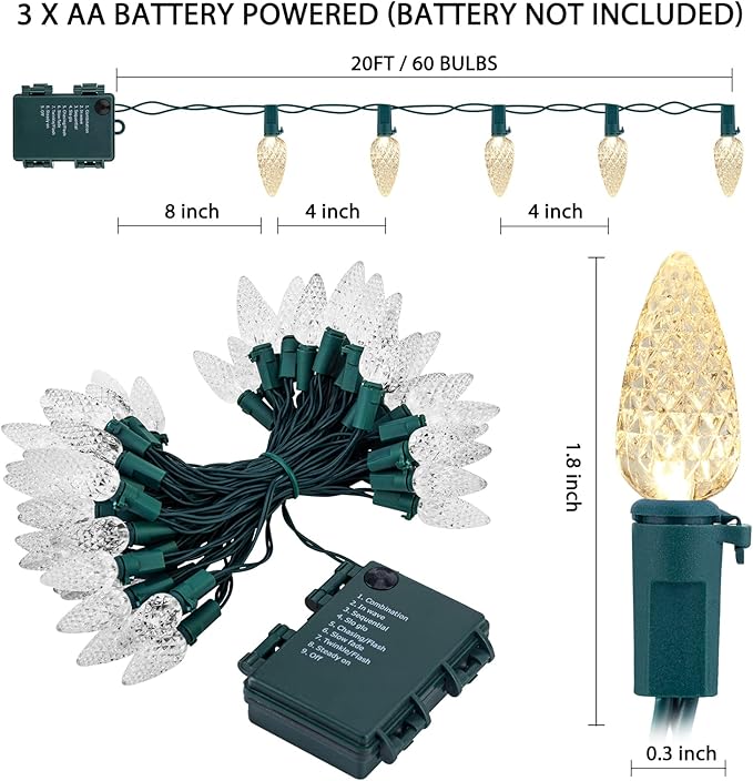 - 8 Lighting Modes: C6 Christmas Lights has 8 different lighting modes, including combination, in wave, sequential, slo glo, chasing/flash, slow fade, twinkle/flash, steady on. Press the button on the battery box to choose your favorite one