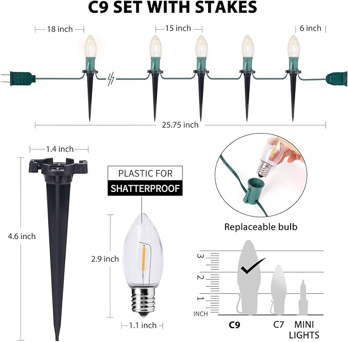 - Vintage LED String Lightswith Stakes: UL listed 25.7 Feet 20 LED lights strands with 15 inches spacing, 20 Stakes, 3.9 inches anchor spike, E17 holder compatible, plug in and enjoy it. It is also an exquisite gift for friends, families, or relatives too