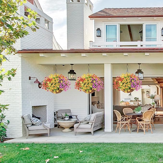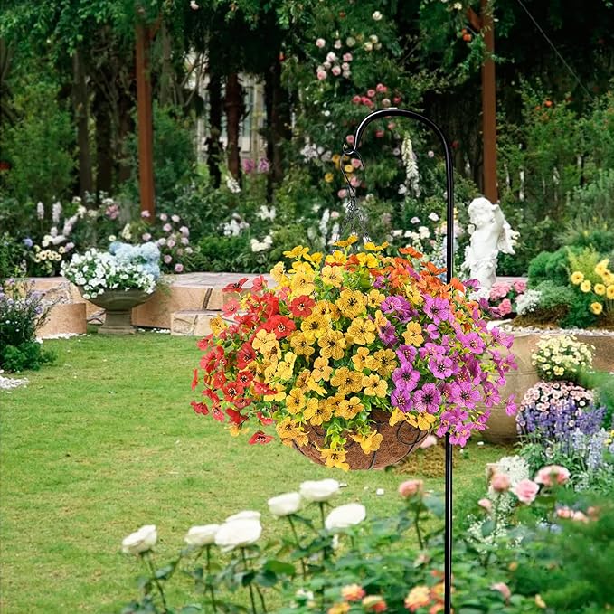 - UV-Resistant: Don't worry about fading โ these artificial hanging outdoor flowers are UV-resistant to keep their vibrancy in the sun.